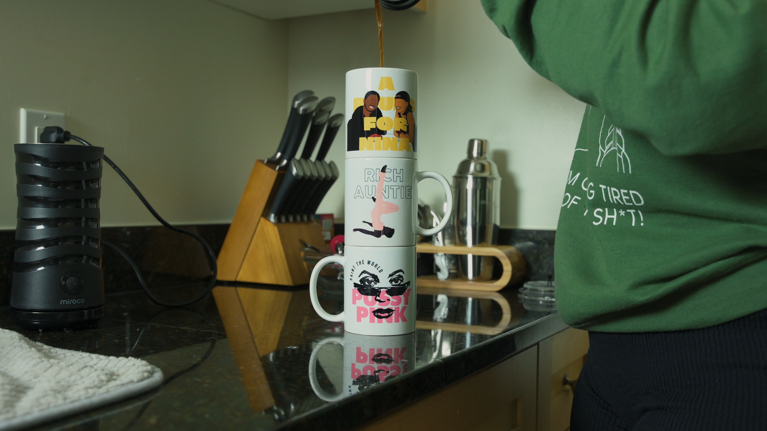 Stacked three coffee mugs with printed designs on a kitchen countertop. The top mug has a cartoon of two people with the text 'A for NIN...'. The middle mug has a cartoon figure with the text 'RICH AUNTIE'. The bottom mug has a face with the text P P